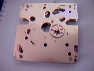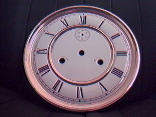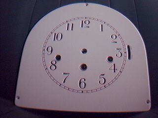 A metal with porcelain like dial face with a time track of 6 1/2". There is a seconds bit above the center arbor hole.